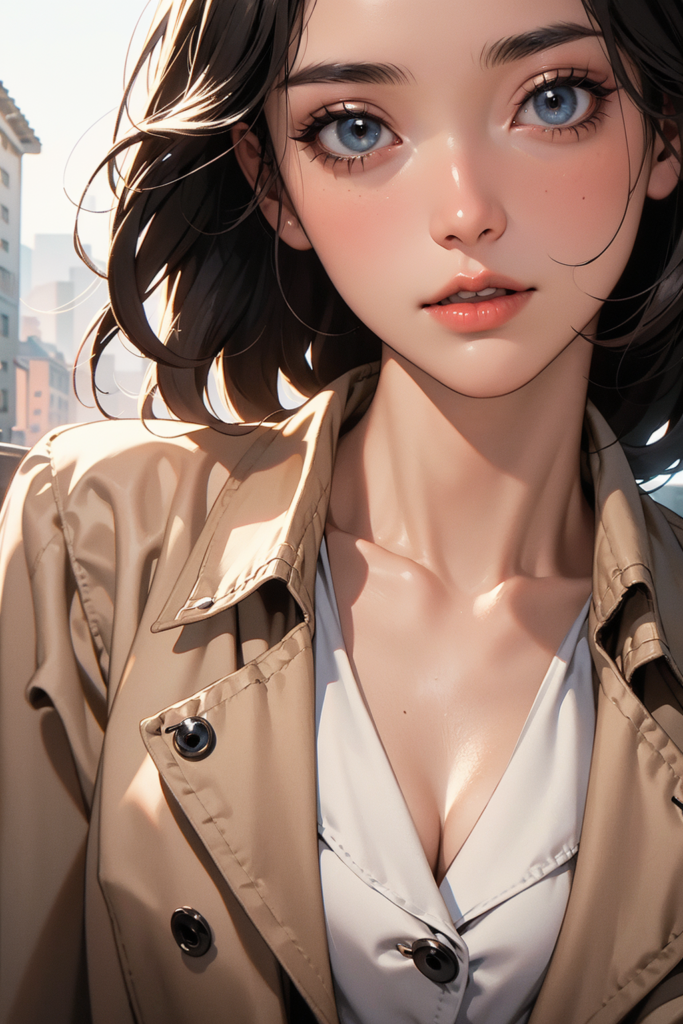 Prompt (Full-body Shot): full body female, walking on street, trench coat, modern outfit, cinematic lighting, natural sunlight, soft shadows, urban background, depth of field, ultra detailed face, realistic skin, anime style, sharp focus